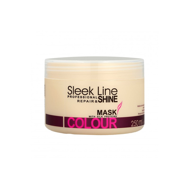 Maska Sleek Line Colour polecana jest do włosów farbowanych, intensywnie nawilża podkreślając kolor, nadając mu nowego blasku. Chroni przed wpływem czynników zewnętrznych, zawiera filtr UV. Dzięki zawartości jedwabiu i wyciągu z pestek słonecznika, maska intensywnie regeneruje włosy. Zawarty w masce wyciąg z migdałów nawilża i odżywia włosy, a kwasy owocowe zawarte w sokach cytrusów przedłużają trwałość koloru i jego blask. Maska jest przeznaczona do włosów i skóry zniszczonej po zabiegach fryzjerskich oraz chemicznych.