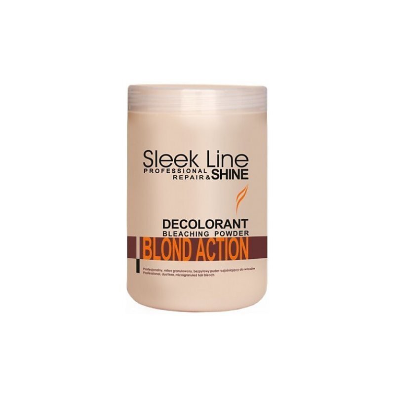 Bezpyłowy rozjaśniacz Sleek Line jest polecany do pasemek, odrostów oraz całych włosów. Nadaje włosom naturalne, piękne odcienie blond uwydatniając ich połysk i jedwabistość. Zawiera delikatną nutę zapachową co czyni go przyjemnym w użyciu. Specjalna technologia Sleek Line Blond Action jest oparta na proteinach jedwabiu które odżywiają, wzmacniają włosy i nadają im blasku. Produkt przeznaczony do użytku profesjonalnego.