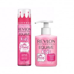Zestaw Revlon Equave Princess Look to szampon i dwufazowa odżywka w sprayu bez spłukiwania. Kosmetyki posiadają hipoalergiczną formułę, która nie podrażnia delikatnej skóry dziecka. Usprawnia rozczesywanie splątanych i napuszonych dziecięcych włosów. Wygładza pasma, usuwa supełki i splątania, broni także przed elektryzowaniem się. Nabłyszcza pukle, zmiękcza i nawilża. Produkty pozbawione parabenów, silikonów oraz sztucznych barwników, przeznaczone dla dzieci powyżej 3 roku życia.